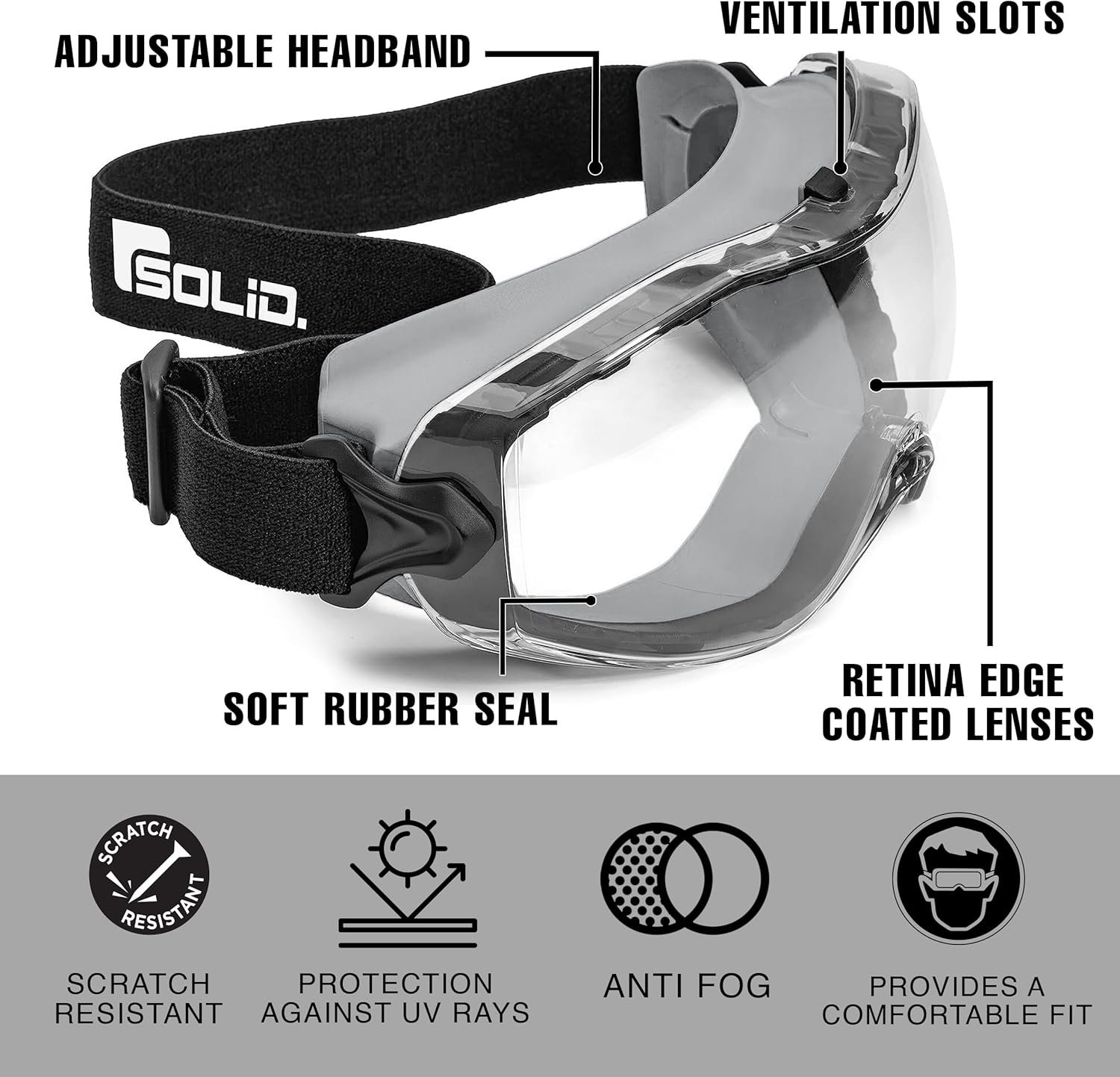 SolidWork Safety Goggles Anti-Fog Clear Lens with Adjustable Elastic Headband. Protective Eyewear for Men & Women