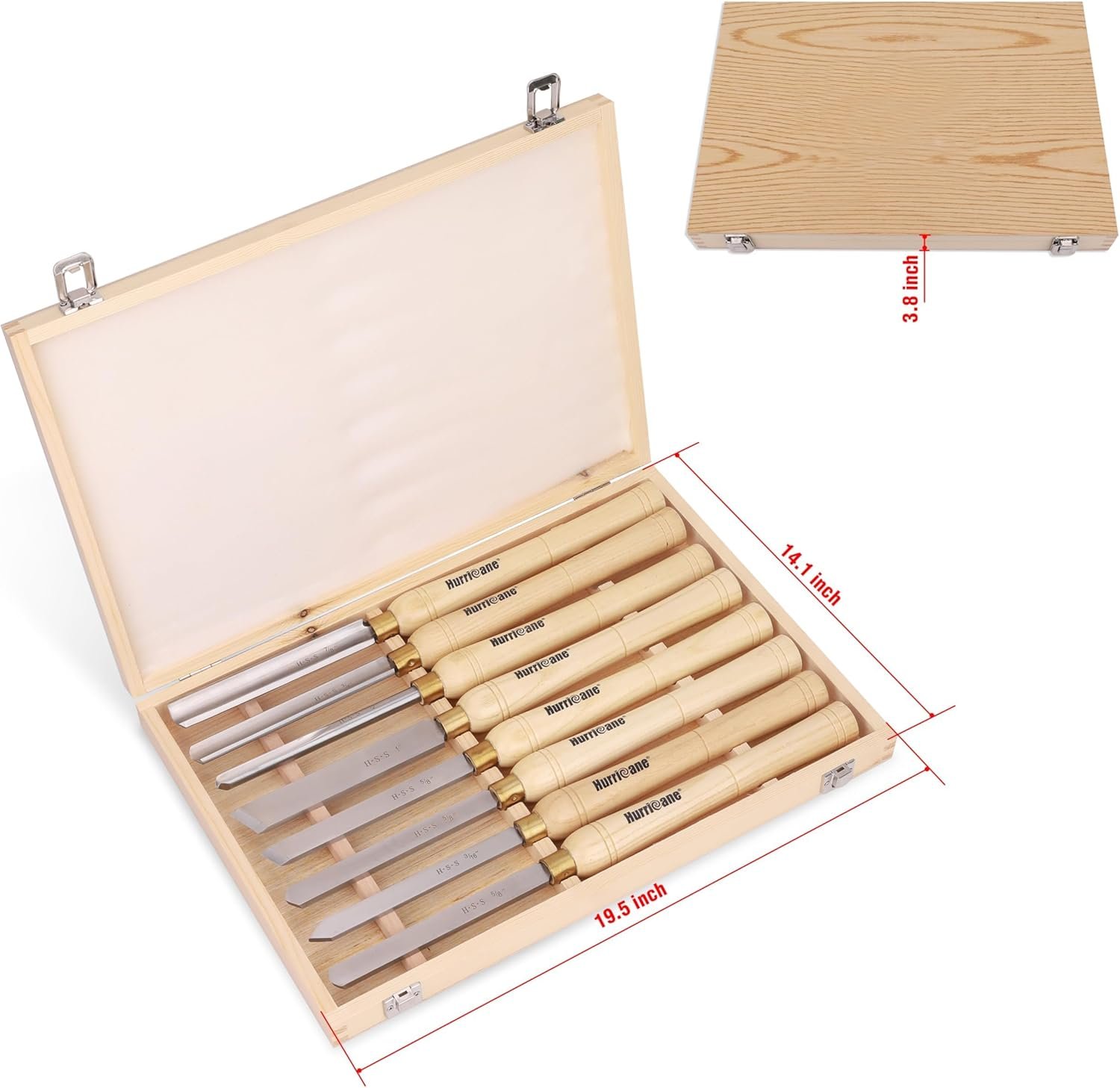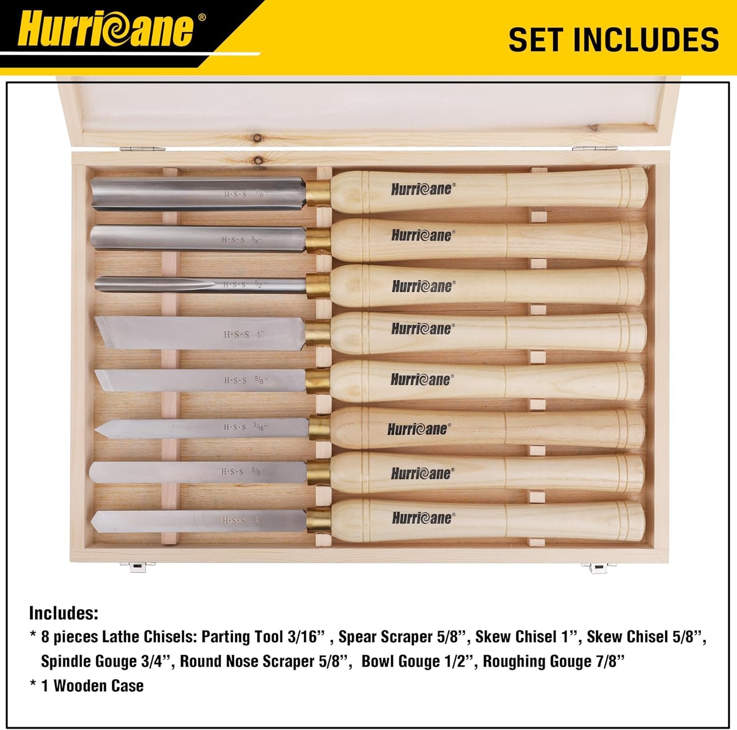 Durable and Sharp Wood Lathe Tools: The HURRICANE Wood Lathe Tools set includes 8 precision-engineered tools designed for woodturning. Blade length 6-1/4″, includes 8 chisels: Parting Tool 3/16” , Spear Scraper 5/8”, Skew Chisel 1”, Skew Chisel 5/8”, Spindle Gouge 3/4”, Round Nose Scraper 5/8”, Bowl Gouge 1/2”, Roughing Gouge 7/8”The set features a variety of chisels such as Parting Tool, Spear Scraper, and Skew Chisel. These turning tools for lathe are perfect for woodworkers of all skill level